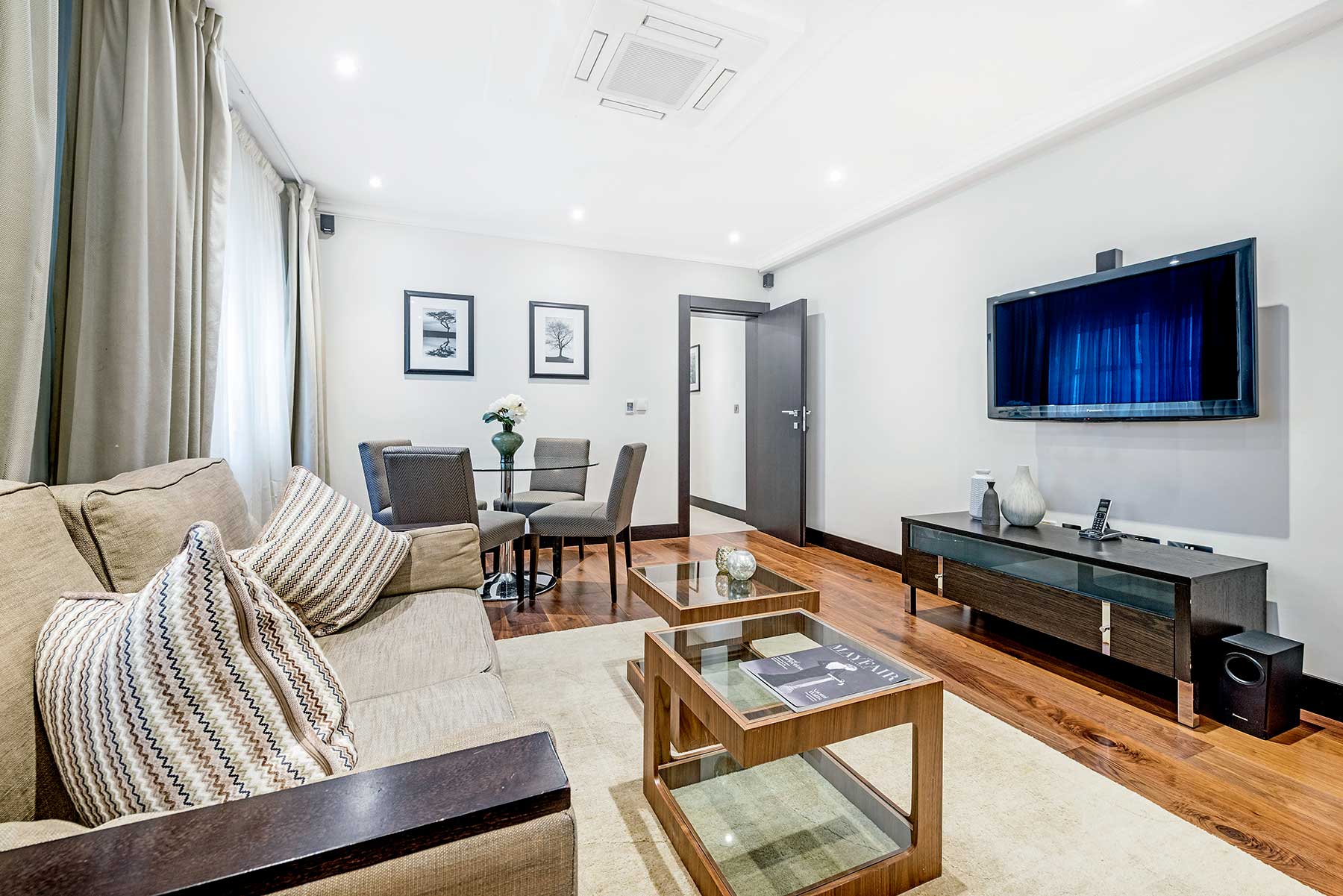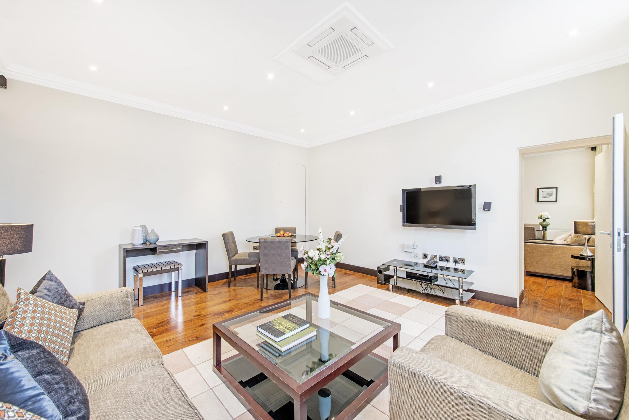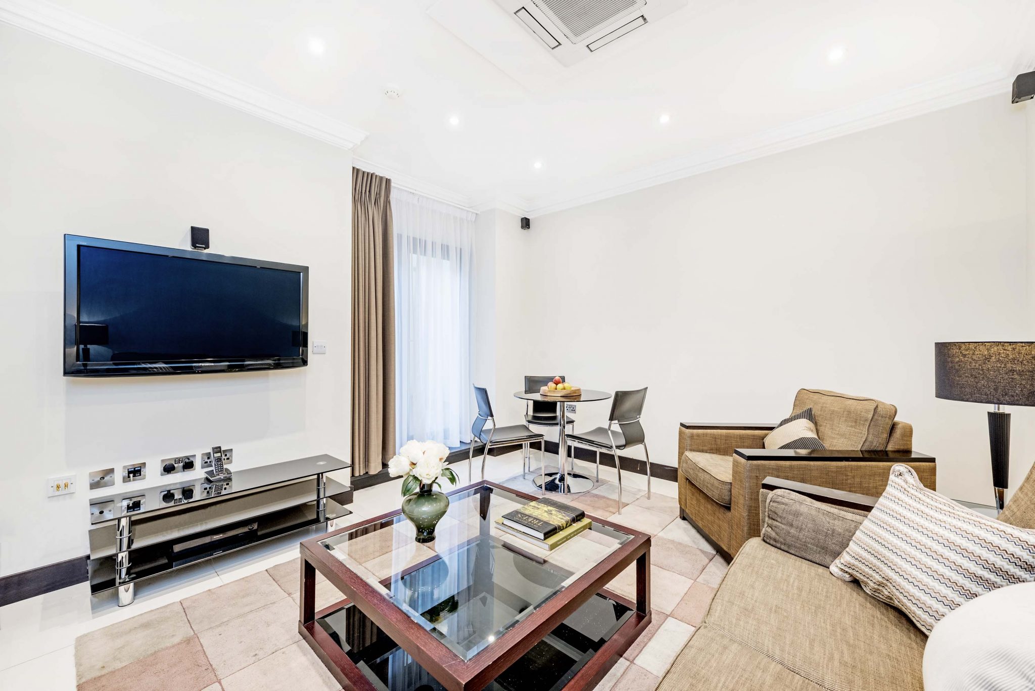The bright, spacious Living/Dining area features premium audio/visual equipment and a sofa bed. The modern kitchen is fully equipped with modern appliances, including Nespresso coffee machine and access to a small courtyard. Two Bedrooms are fitted with King-size beds (both can be divided into twin beds if required), and the third Bedroom, with a Queen-size bed. The Master bedroom includes an en-suite bathroom and a further bathroom is fitted with a bath and power shower.