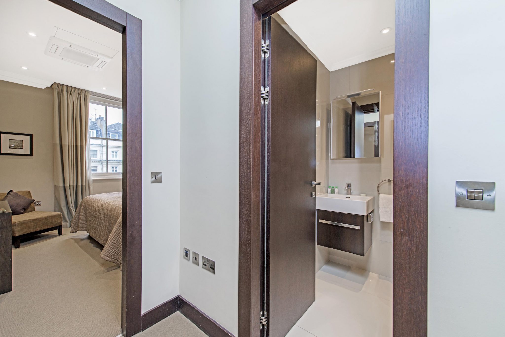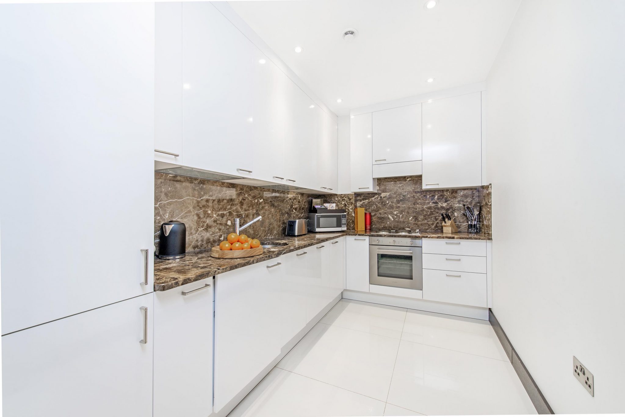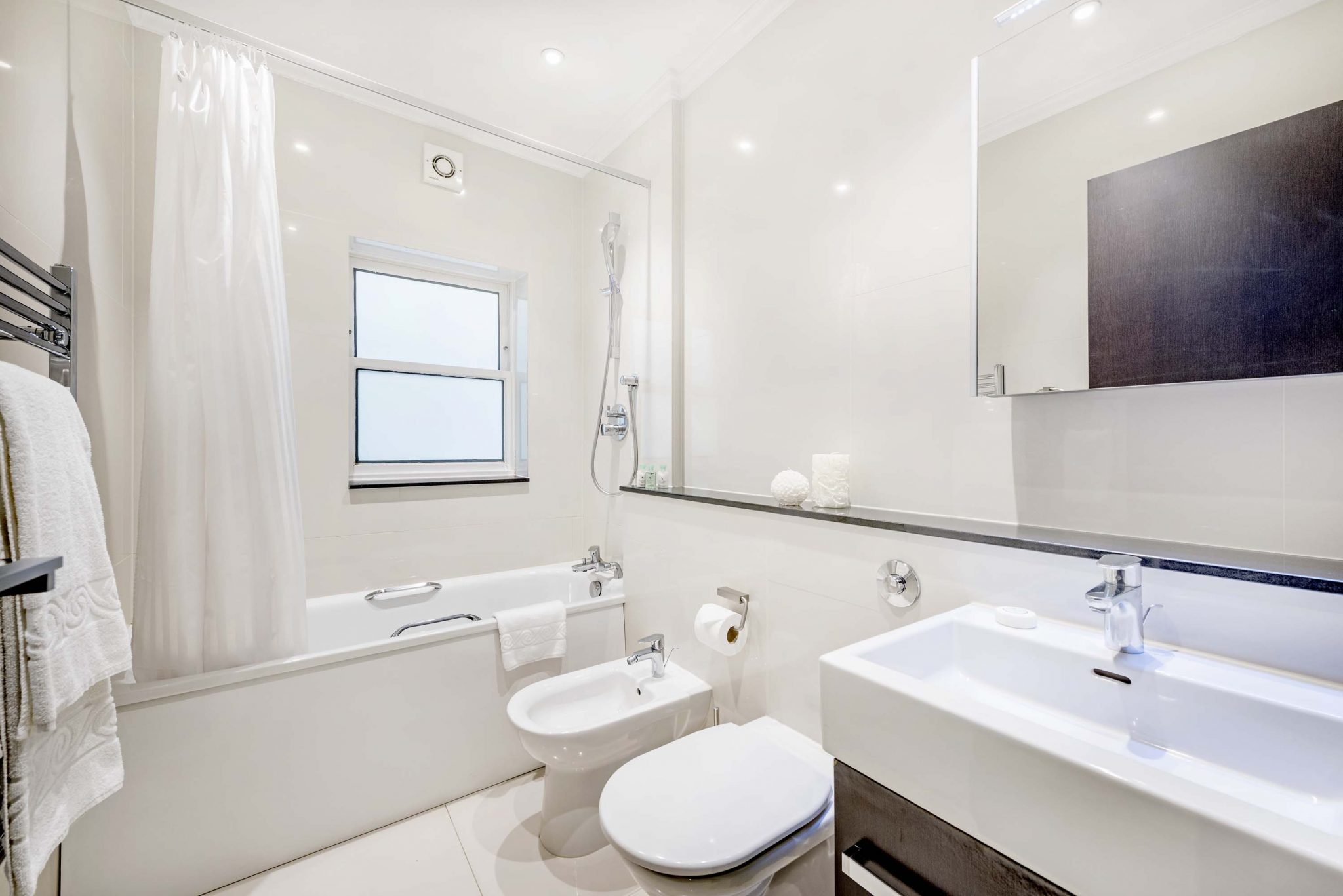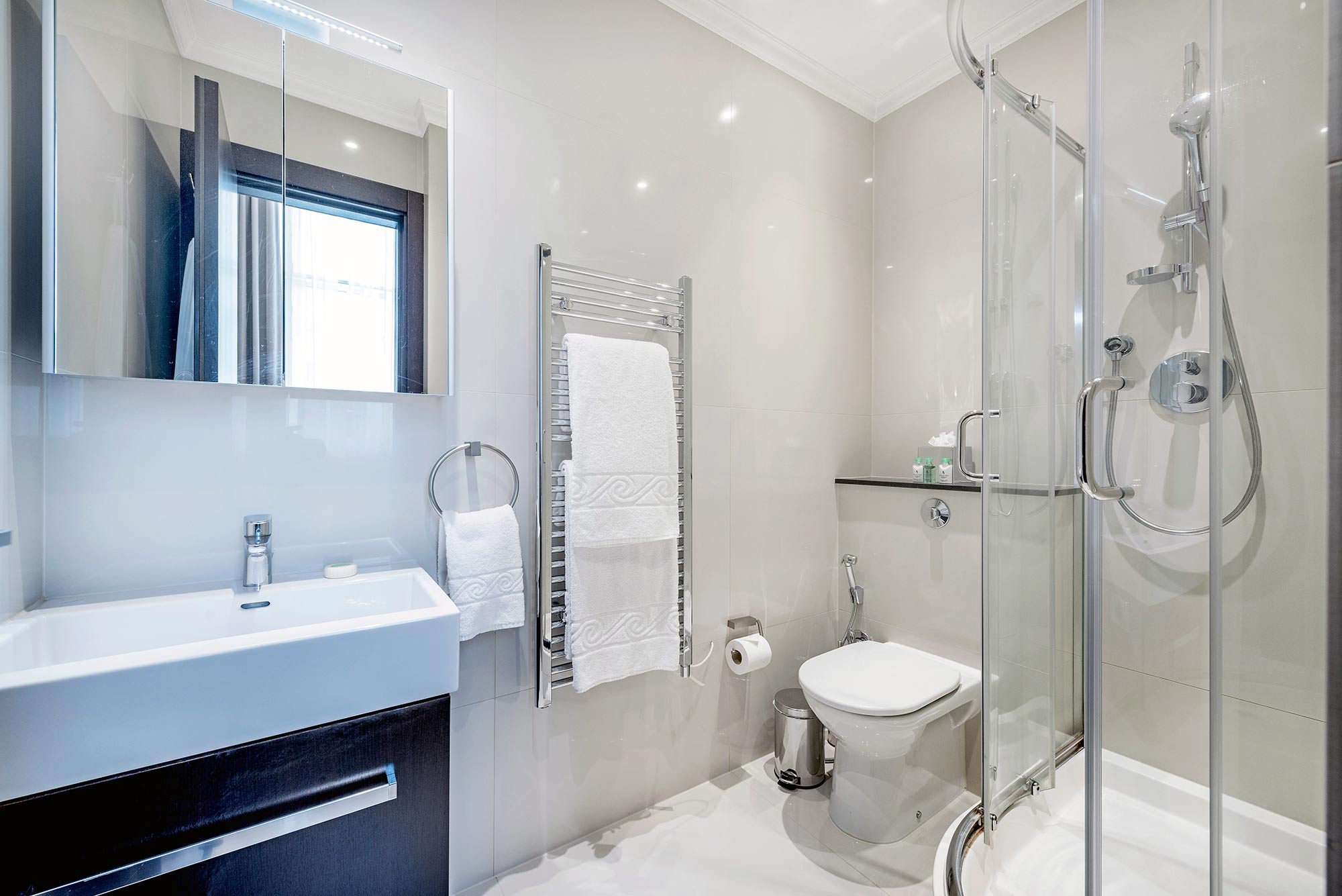 The bright, spacious Living/Dining area features premium audio/visual equipment and a sofa bed. The modern kitchen is fully equipped with modern appliances, including Nespresso coffee machine and access to a small courtyard. Two Bedrooms are fitted with King-size beds (both can be divided into twin beds if required), and the third Bedroom, with a Queen-size bed. The Master bedroom includes an en-suite bathroom and a further bathroom is fitted with a bath and power shower.